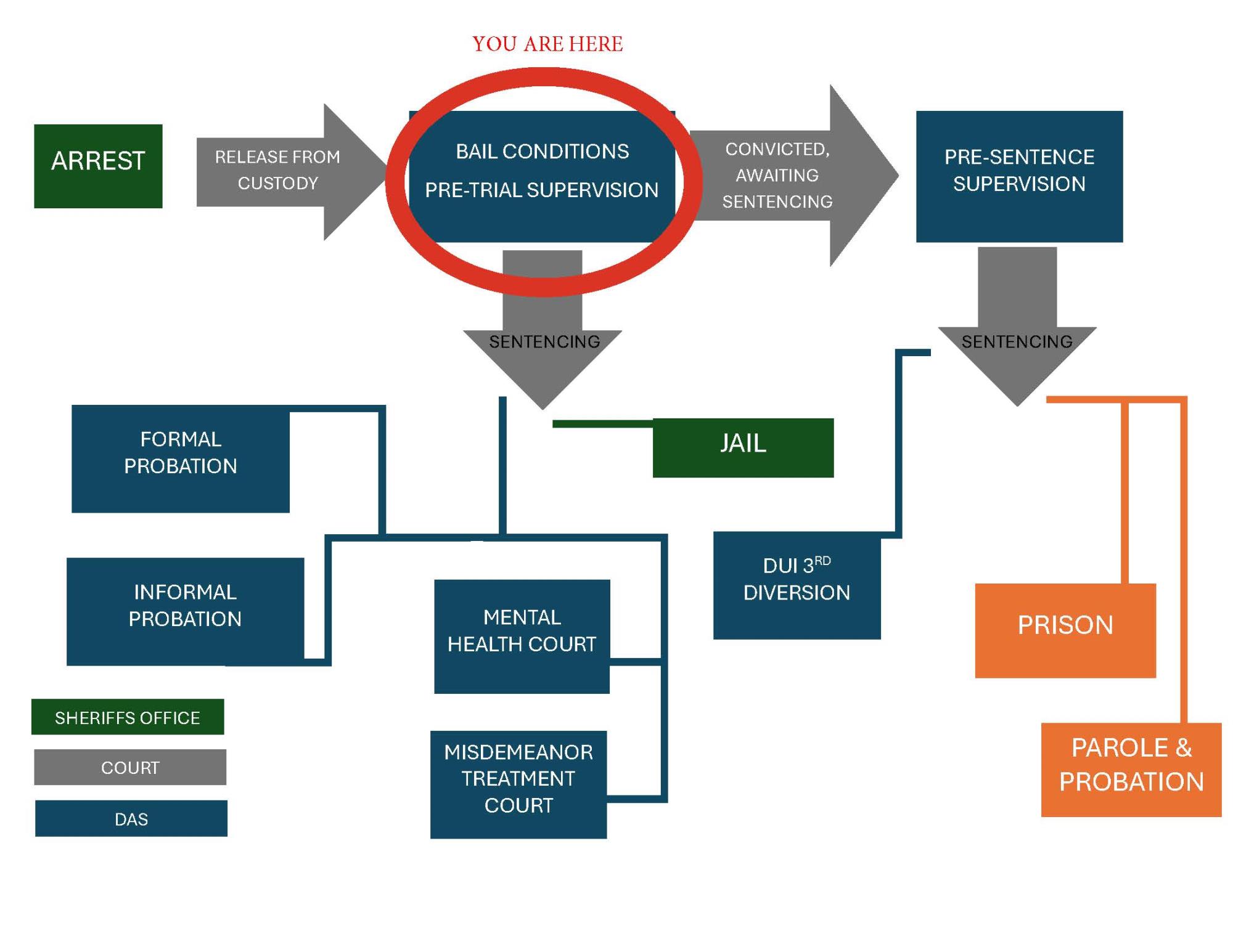 From the time they are released from custody to their sentencing hearing, they will be placed on Bail Conditions or Pre-Trial Supervision. Pre-Trial Case Managers will then monitor the standard and special conditions, ensure compliance, and provide reports- when necessary- for their next court hearing.