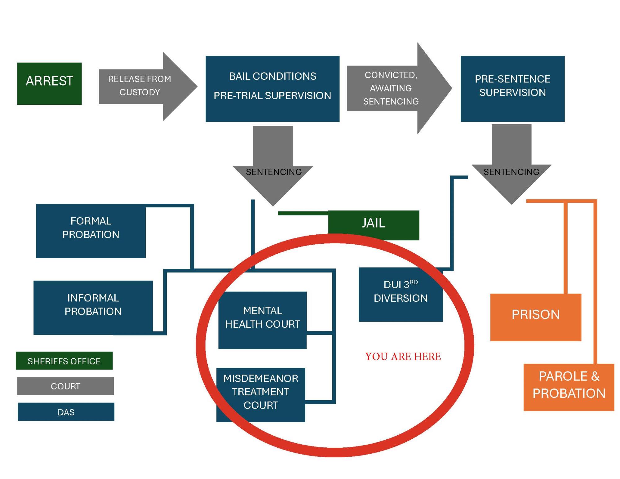 The Department of Alternative Sentencing has a dedicated Case Manager that supervises the participants in the three specialty courts including Mental Health Court (MHC), Misdemeanor Treatment Court (MTC), and DUI 3rd Diversion (DUI Court).