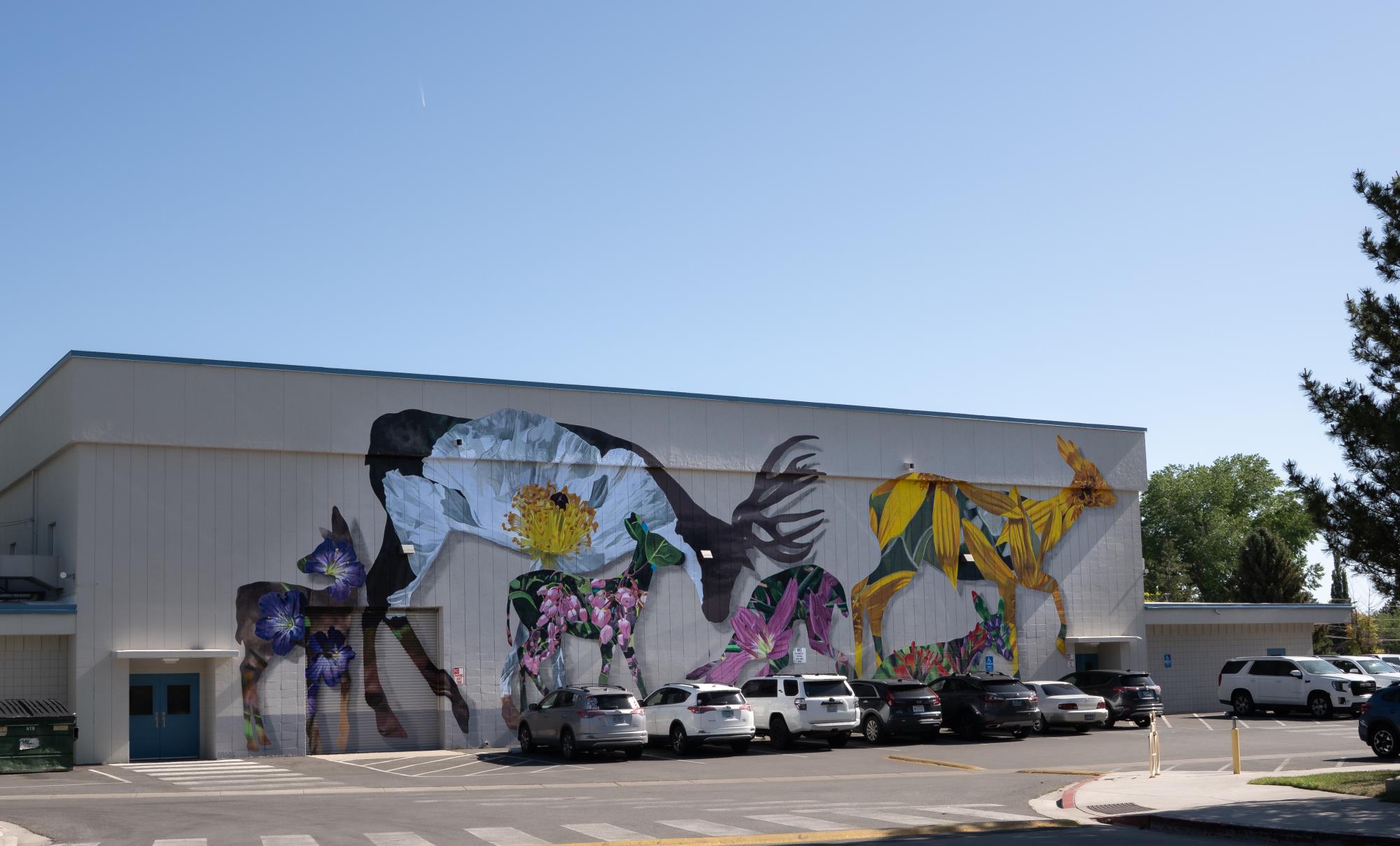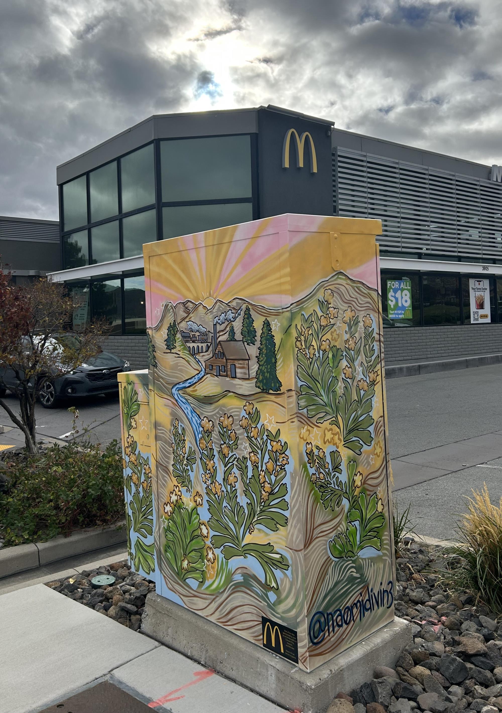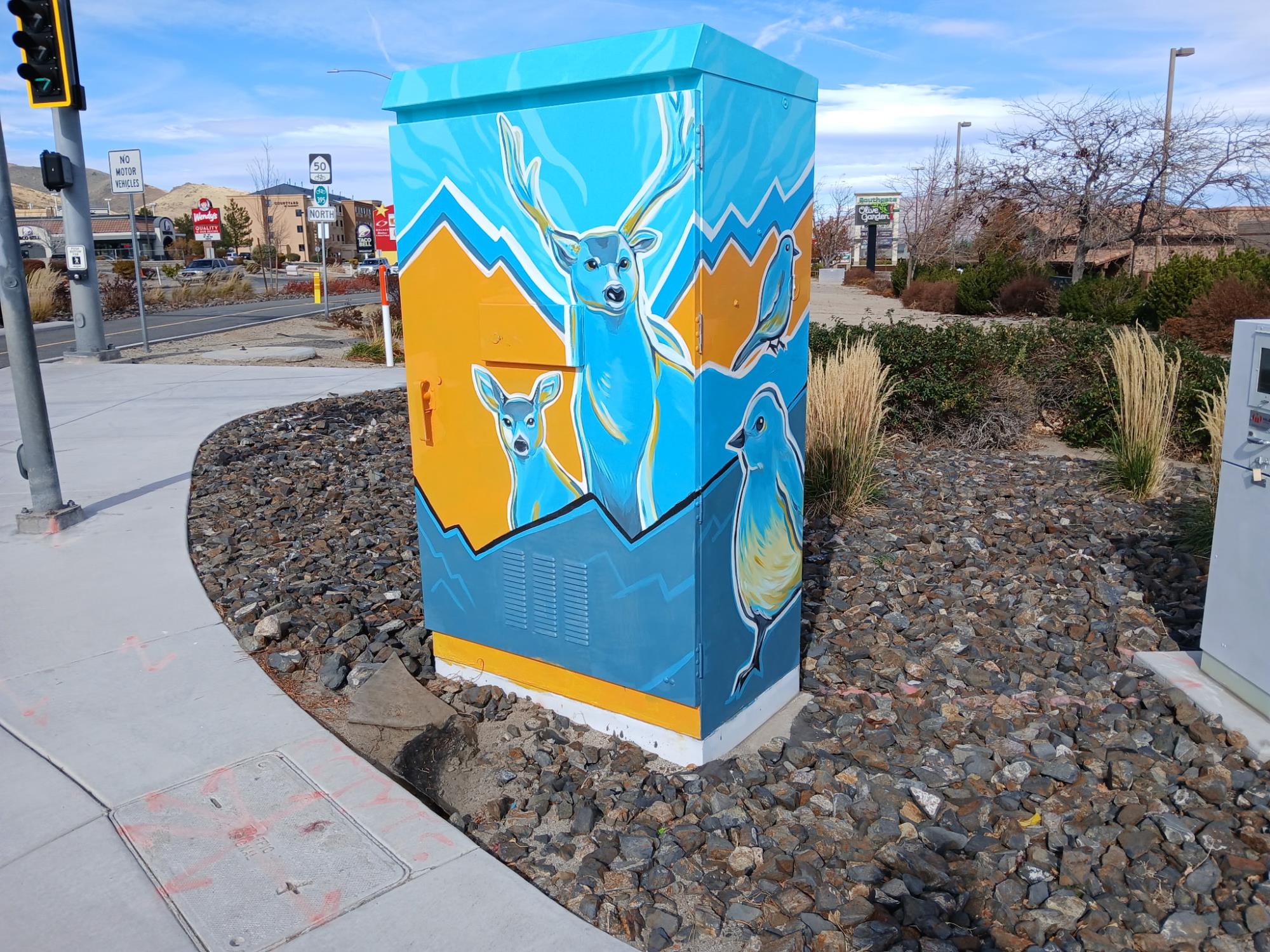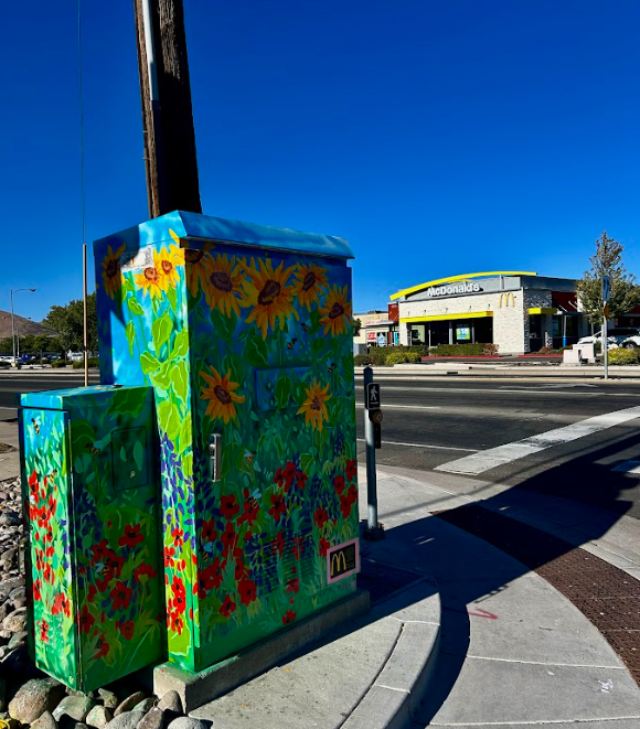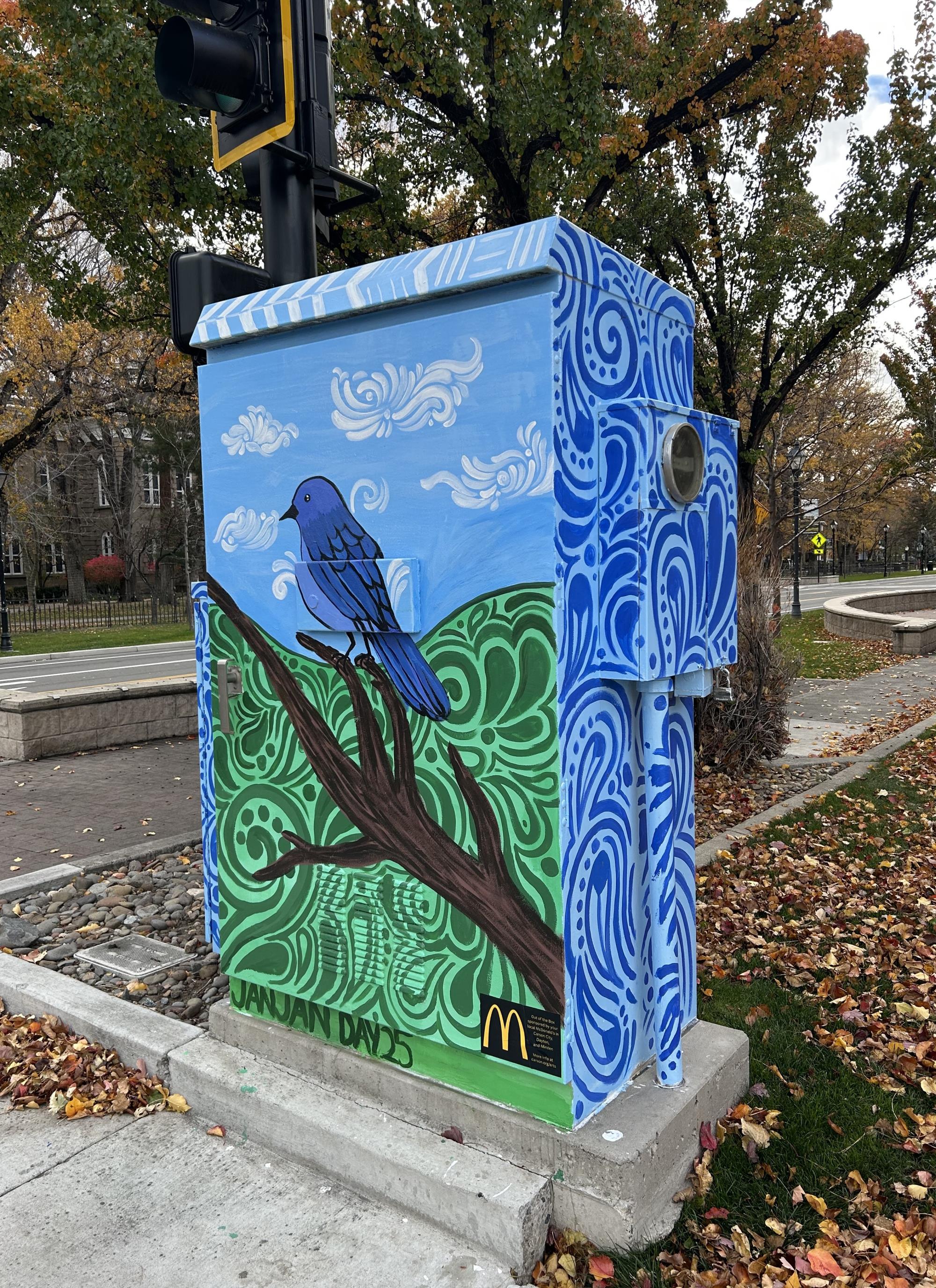 I wanted to share my appreciation of nature here and wanted to paint and express the beauty of the state bird and the state flower which is the Mountain bluebird and the Nevada sagebrush. The design on the sides of the signal box is my own style of abstract line work, but it also incorporates feathers, specifically the eagle feathers Cherokee Indians used for smudging and ceremonies, and elements of Cherokee tribal print on the front and back of the signal box. While Cherokee are not natives to Nevada, there is a presence of Cherokee Indians here. My partner was the reason why I’ve come to love Northern Nevada and its rustic lifestyle. So this [design] is to honor my partner and his family, since his grandfather was Cherokee Indian and lived in Nevada his whole life.