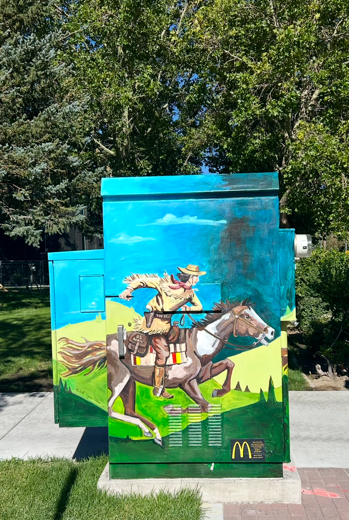 [My design highlights] the historical Pony Express. The route passed through Carson City, Nevada, which was a designated Pony Express station and riders would stop there to change horses and deliver mail. The city was even home to a Pony Express office at one point. Nevada has 47 pony express stations and over 417 miles of Pony Express Trail.