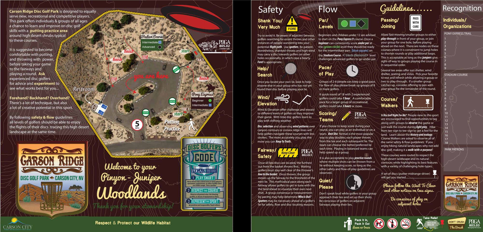 The Stadium Course has 18 holes which will challenge both the intermediate and experienced disc golfers. You may be ready to 'graduate' to this course when you can reliably score under par on the Pony Express course. Playing the course is a scenic tour of high desert sageland, a slot canyon with interesting rock outcrops as obstacles, and a prominent ridge overlooking Carson City at the foot of snow capped mountains. The tee signs list par for both intermediate and advanced levels, making it easy to play handicapped rounds between different abilities. You can learn the species of plants and wildlife you may encounter on the course from each tee sign.
