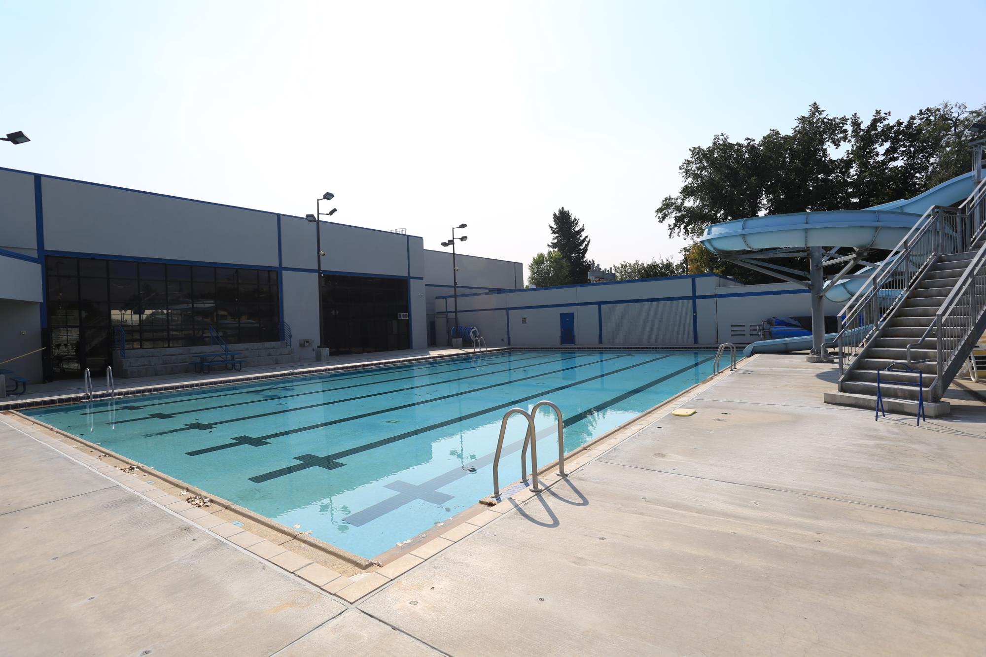 The outdoor pool is operates seasonally from the beginning of May through mid-September, weather permitting. It has 6 lanes measuring 25 yards in length with a depth from 3.5 feet to 6 feet at the deepest, with a 16 foot tall, open flume water slide. Pool temperature is between 79 - 81 degrees.