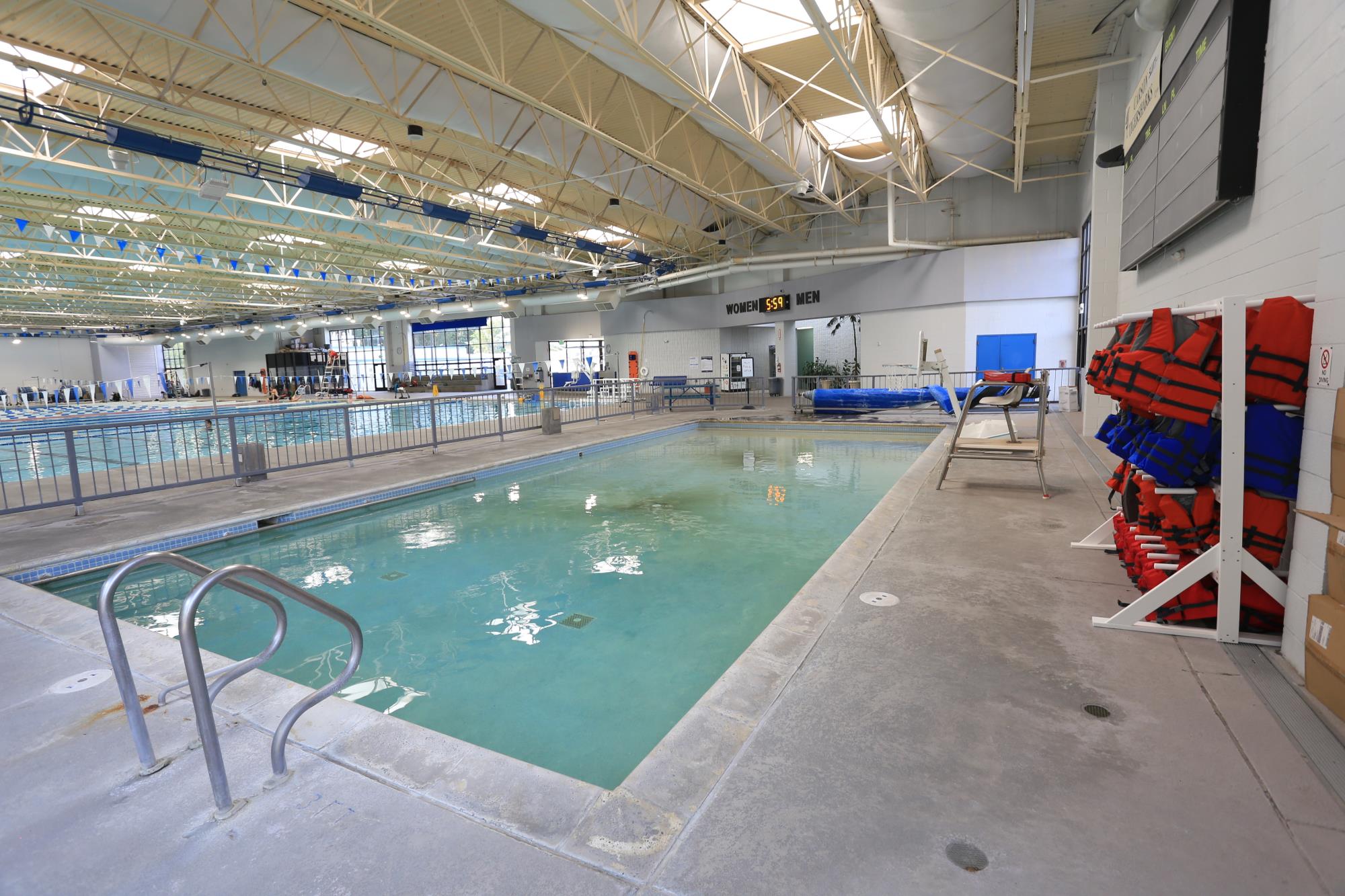 The therapy pool is designed for use by the disabled or physically challenged, with a hydraulic lift, gradually sloped ramp, and shallow steps for easy entry. Pool temperature is slightly warmer for greater comfort. Pool is open to adults, 18 years old and older, or others who can show need. Due to the nature of this pool’s design, it will be not be used for recreational swimming. Pool temperature is 92 degrees.