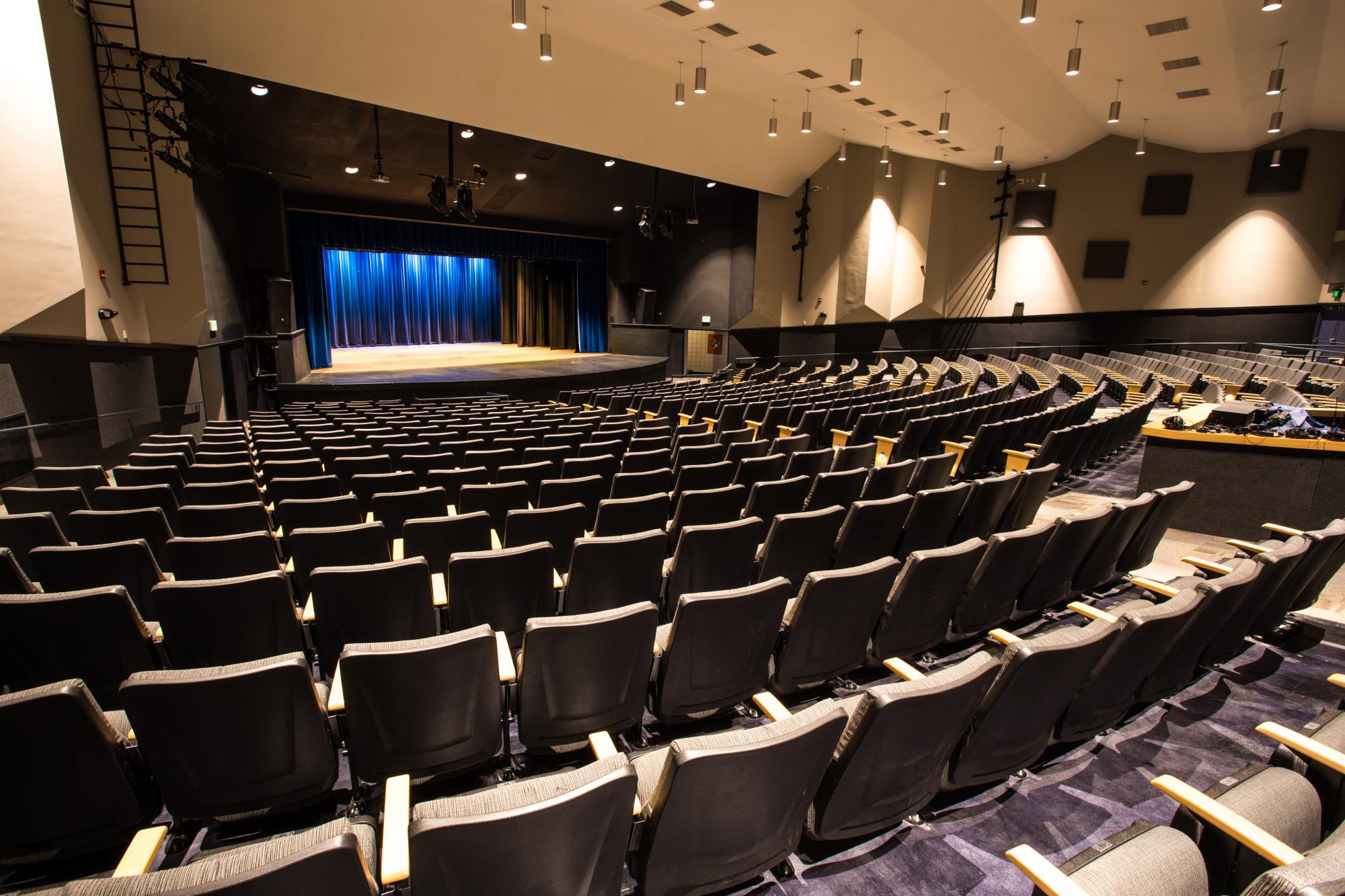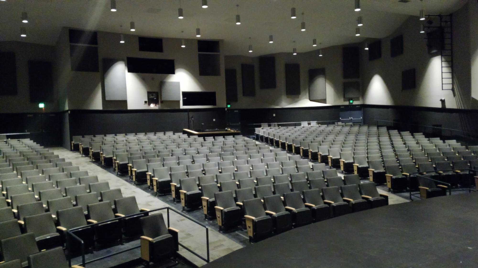 The Bob Boldrick Theater is a well-equipped theater which accommodates an evening's entertainment for up to 584 people (564 general seating, 10 wheelchairs, and 10 companions). Setting and technical equipment can be provided for such events as plays, lectures, movies, concerts, and religious services.